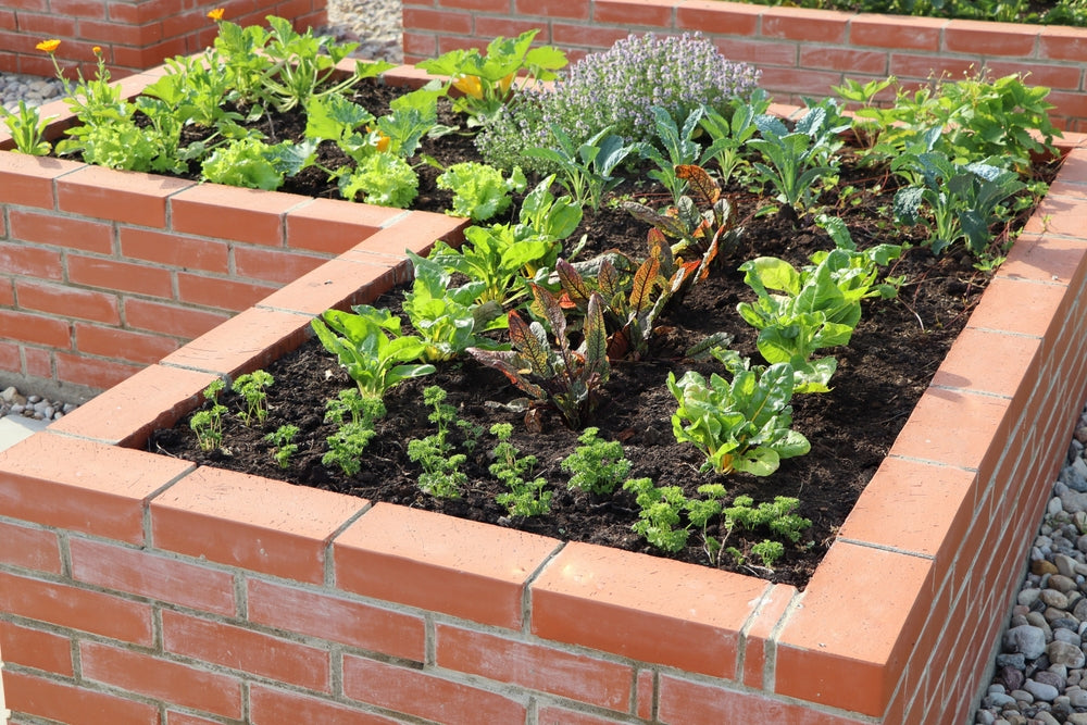 Gemauertes Hochbeet mit frisch gepflanztem Salat, Mangold, Grünkohl und Kräutern.
