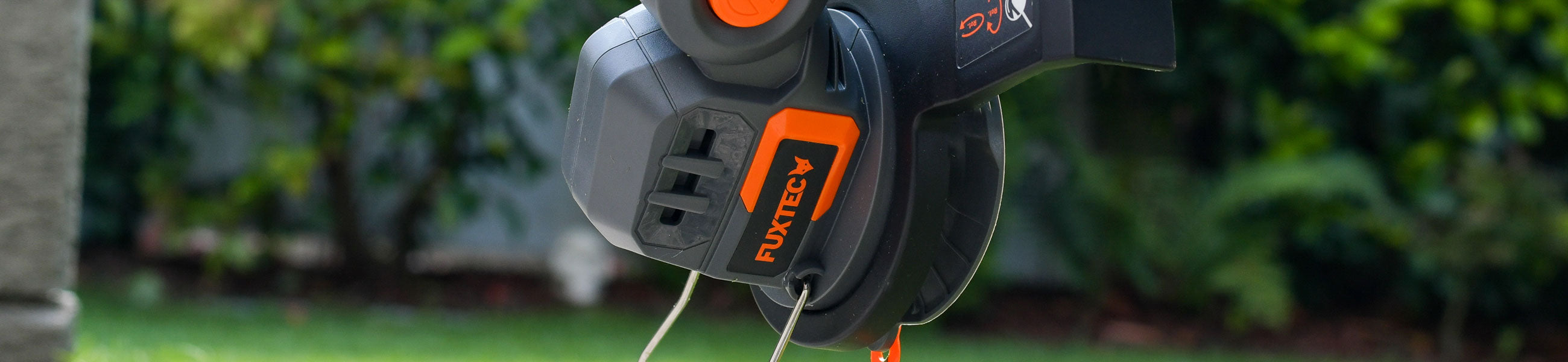 Las desbrozadoras y cortabordes a batería de Fuxtec suelen tener un cabezal de hilo. Esto incluye, por ejemplo, la recortadora de césped a batería E1RT20 FUXTEC de 20 V, que tiene un carrete de hilo de doble cara con avance automático y un grosor máximo del hilo de 1,6 milímetros. Ya sea para recortar el césped, cortar la hierba o eliminar las malas hierbas: los cortacéspedes con cabezal de hilo pueden utilizarse universalmente. El cabezal de hilo consiste en un carrete en el que se enrolla un hilo de plástico estable hecho de nailon. Los dos extremos sobresalen del cabezal de hilo y azotan la hierba cuando el cabezal gira. Los cortabordes inalámbricos con hilo de corte son muy adecuados para trabajos finos, por ejemplo en las paredes de las casas, ya que no dejan ningún daño. Sin embargo, los cortabordes con cabezal de hilo alcanzan sus límites cuando tienen que cortar maleza espesa. En ese caso, es más adecuado un aparato con cuchilla de recorte, que corta maleza de hasta 1,5 centímetros de diámetro o incluso de hasta cinco centímetros si la cuchilla es de dos o tres filos con las puntas curvadas hacia abajo.