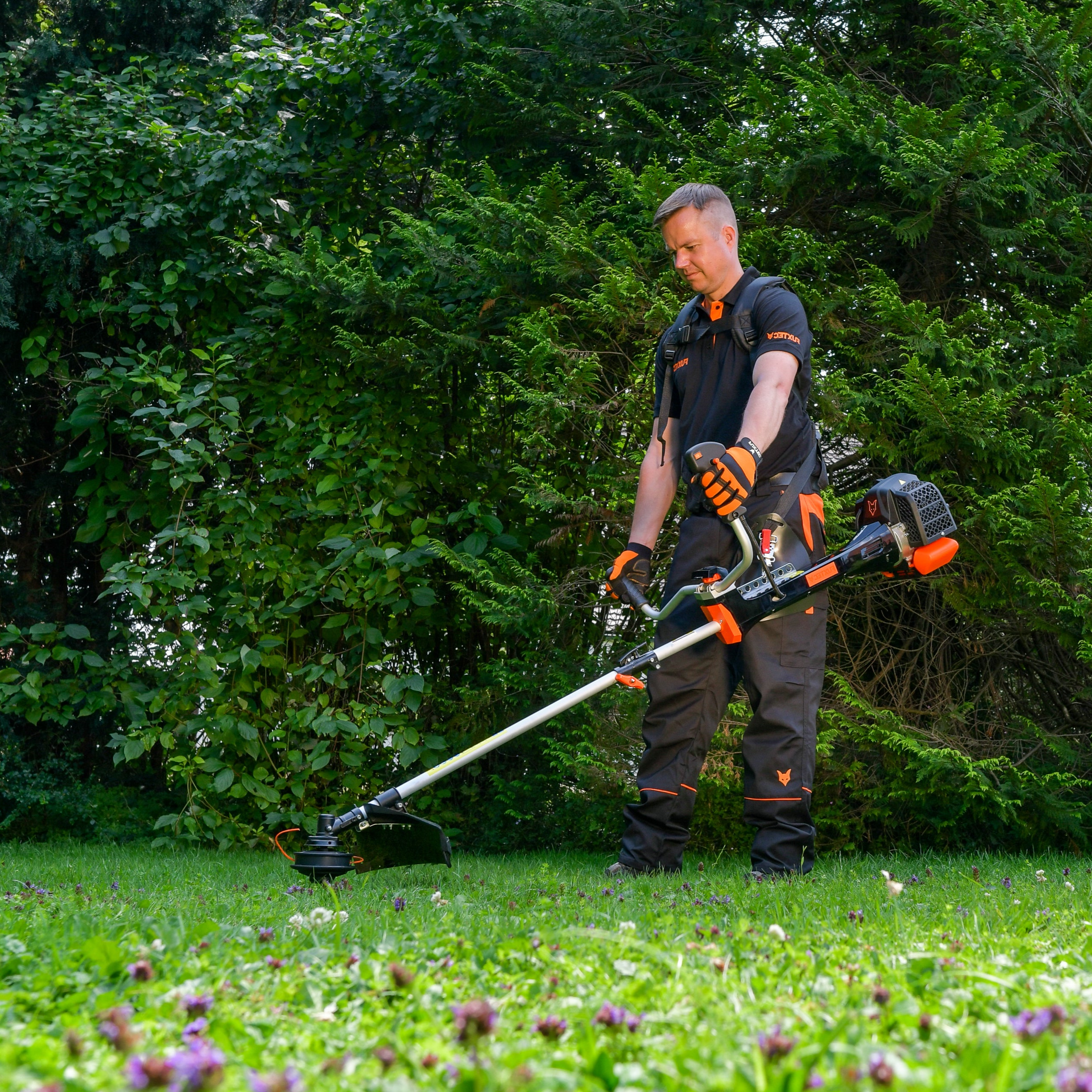 Mobilität und Mehrfachnutzen mit einem Antrieb. Motorsense mit leistungsstarkem 2-Taktmotor und mehr Drehmoment aufgrund seines neuen 52ccm Motors.